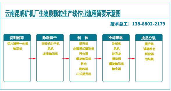 雖然使用的原料多種多樣,但是萬變不離其宗,以生物質造粒機為核心設備的一整套生產線基本生產流程可以大致分為:切割粉碎、除濕烘干、造粒、冷卻、成品分裝等幾個環節。下面就是成套生物質顆粒生產線的工藝流程示意圖: